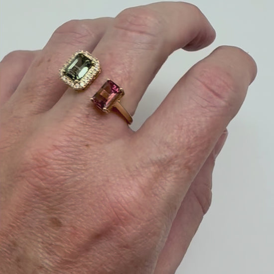Anillo en Oro amarillo 14K con turmalina y diamantes.