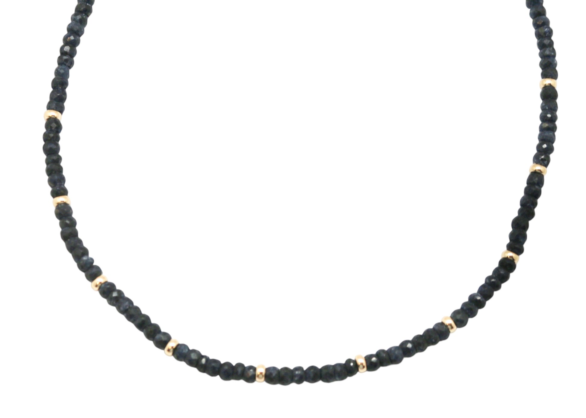 Collar con cuentas de zafiro, bolitas y broche en oro 14K.