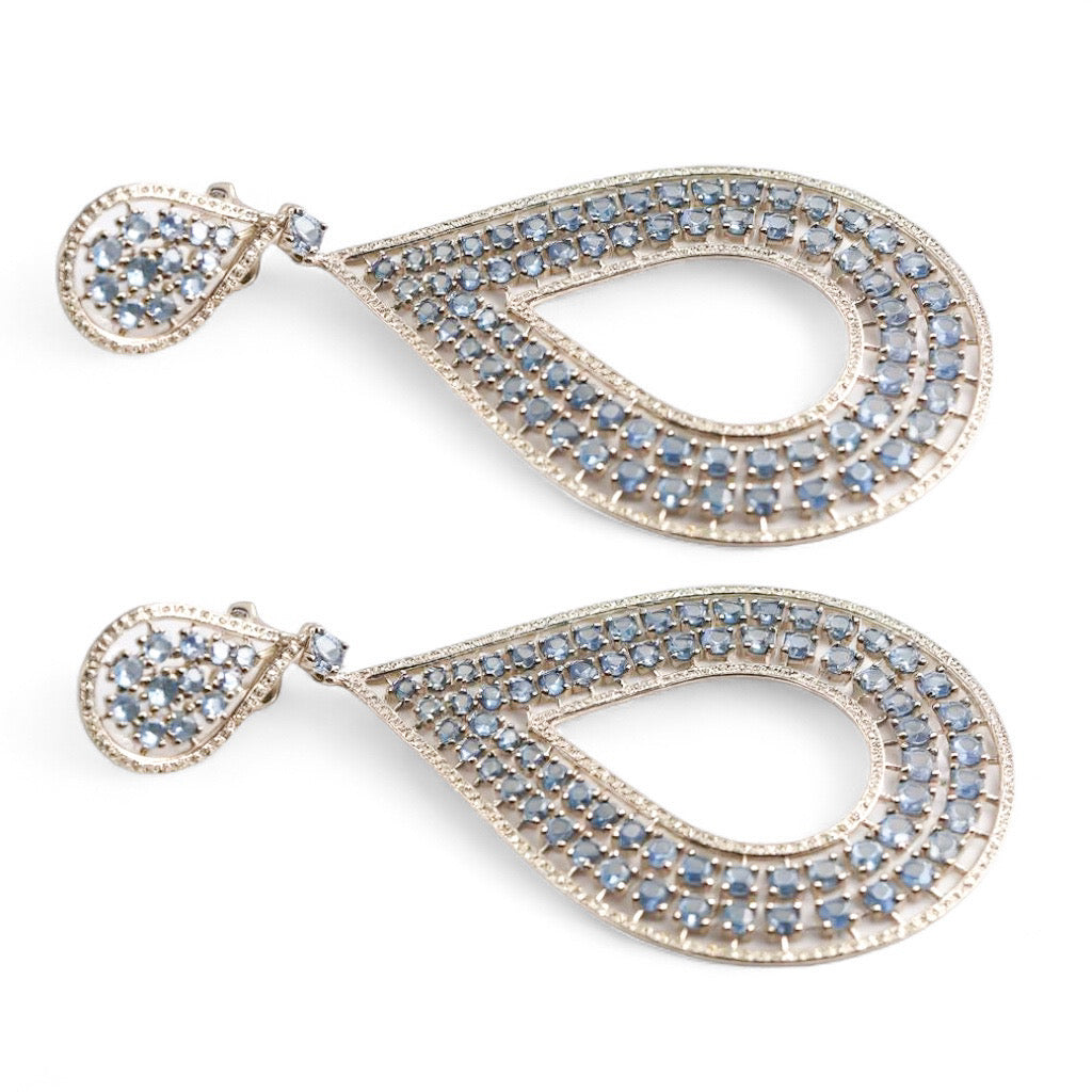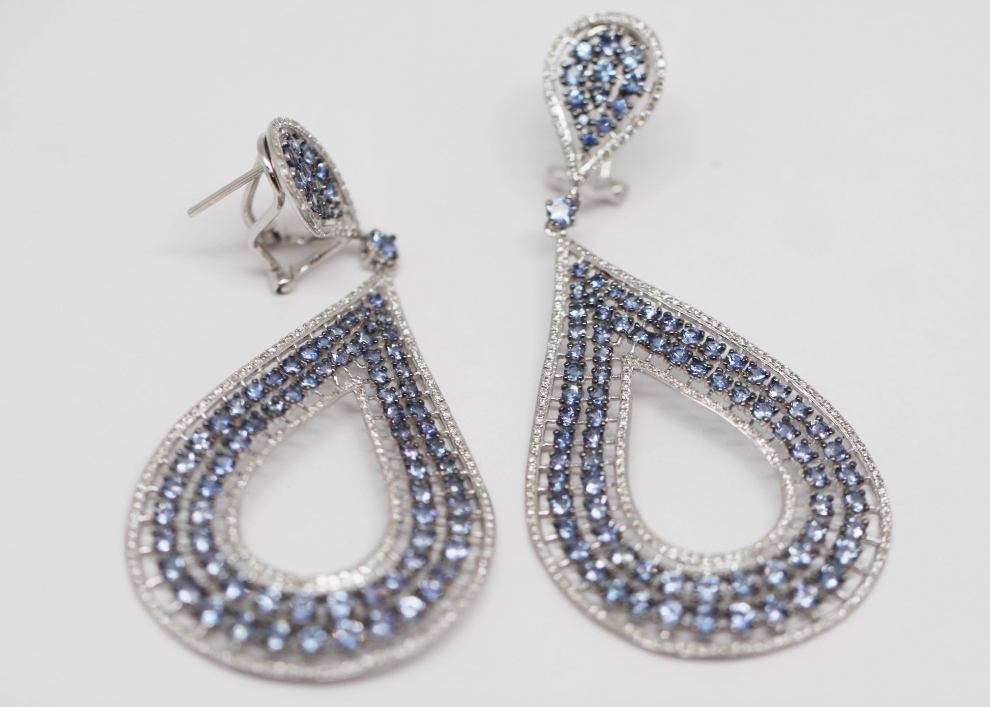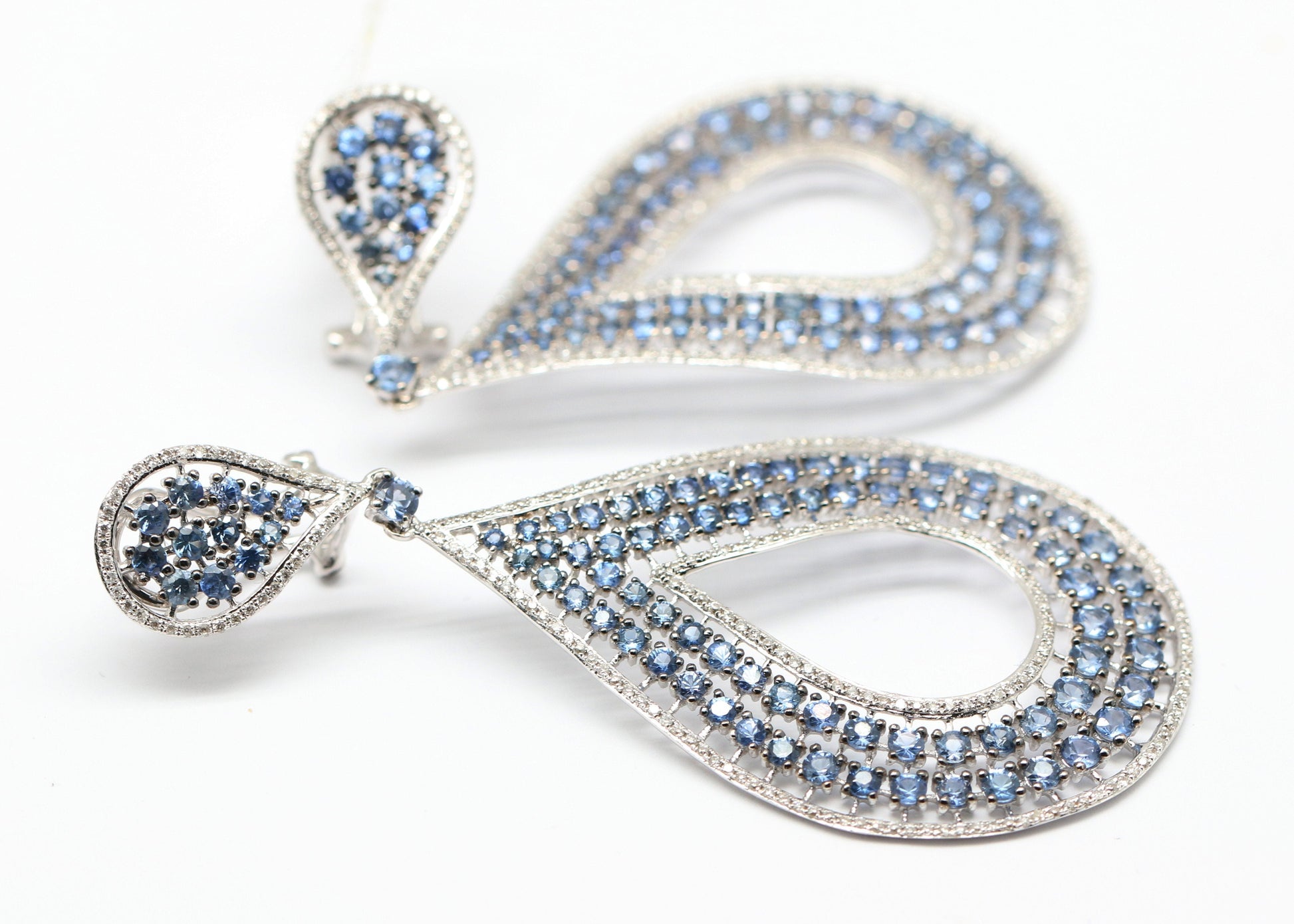 Aretes largos en oro blanco 14K con 7.06QTES de Zafiro y 0.40 QTES diamantes.