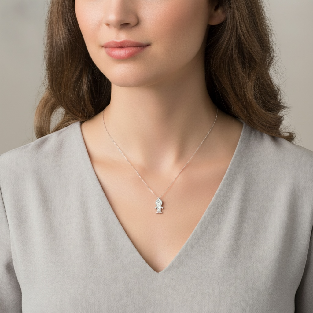 Dije de muñeco en oro blanco 14K con 0.12 Q de diamates.