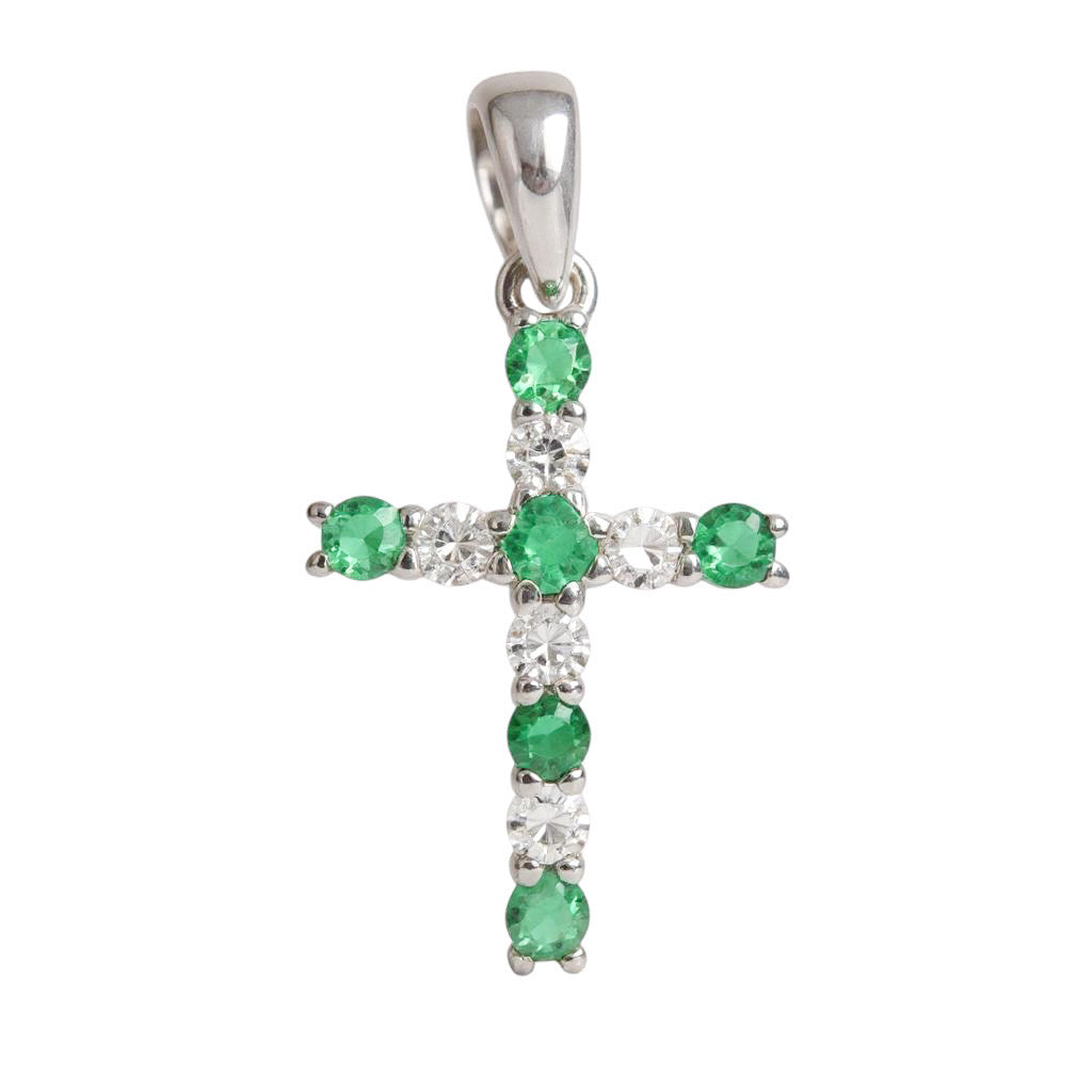 Cruz en oro blanco 14K con diamantes y esmeralda
