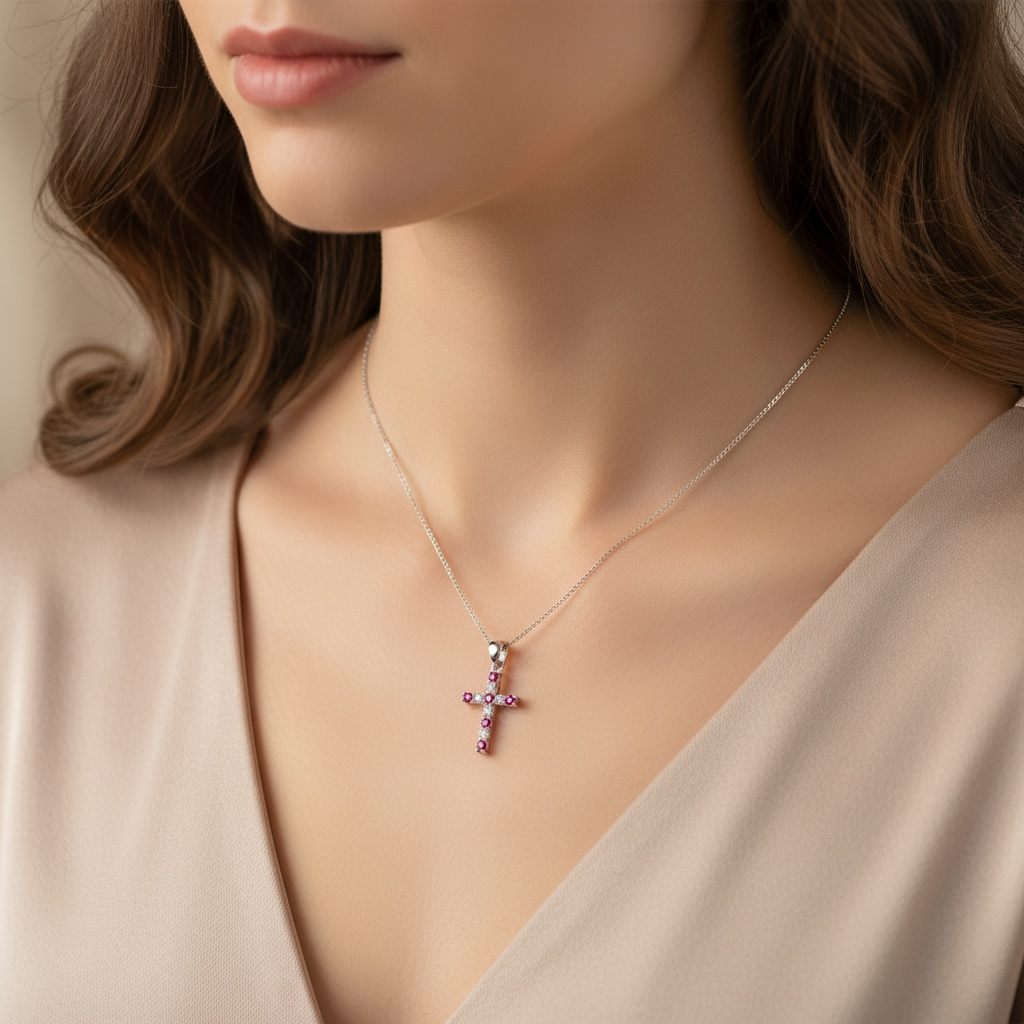 Cruz en oro blanco 14K con 0.05 CT diamantes y 0.07 CT rubí