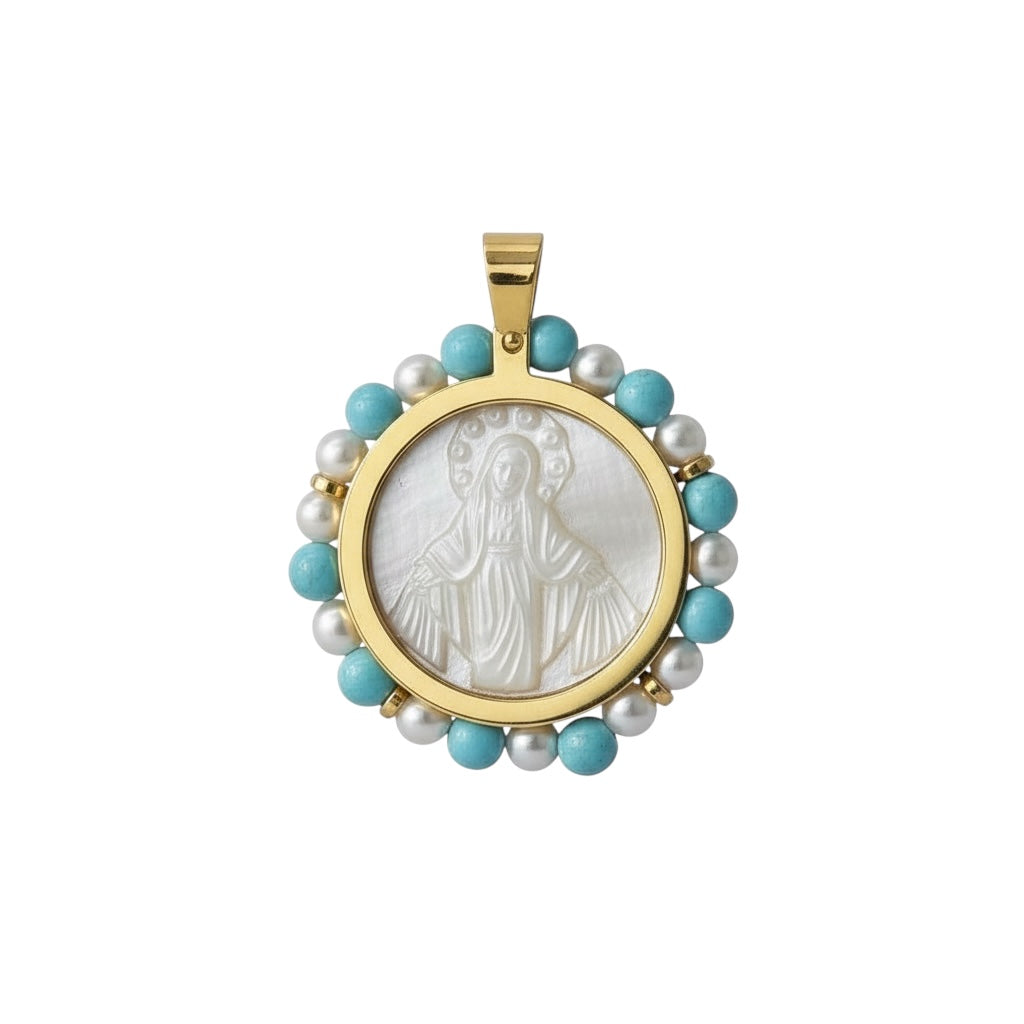 Medalla virgen en oro 14K con turquesa y Madre Perla.